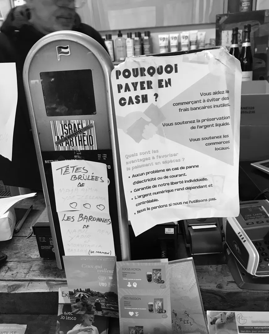 Een biowinkel in Sint Gillis, Brussel. In een pamflet opgehangen naast de pinautomaat wordt uitgelegd waarom cash geld hier meer waard is dan een betaling per kaart. Sinds 2022 zijn alle winkeliers in Belgie verplicht een digitale betaalmogelijkheid aan te bieden.