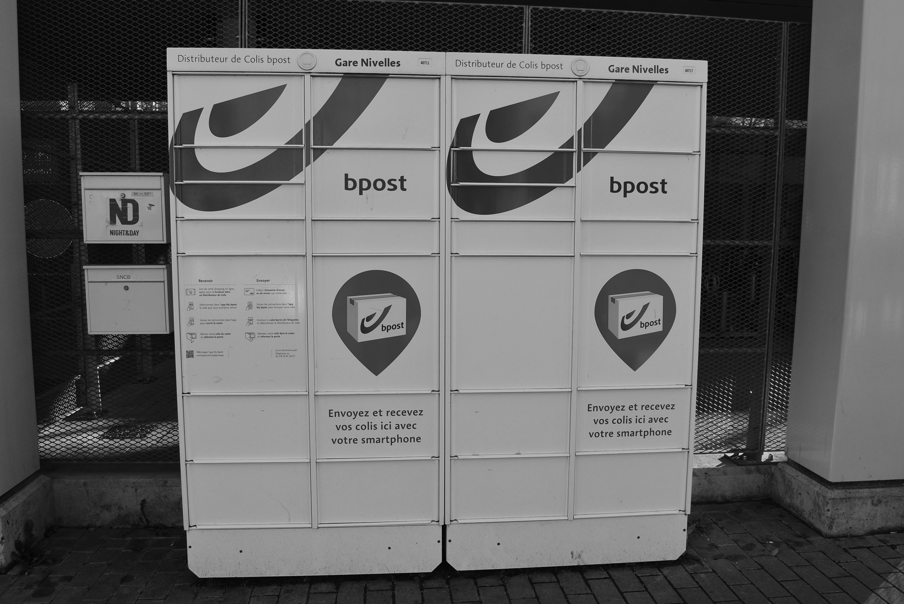 Naast de ingang van het station van Nijvel staat een Distributeur bbox waar je pakjes kunt ontvangen en versturen 'met je smartphone'. In Belgie zijn er ondertussen meer dan 1700 in de openbare ruimte te vinden -- bij bibliotheken, winkels, stations, ziekenhuizen en postkantoren. De meeste automaten hebben geen scherm, je kunt de service enkel gebruiken wanneer je de bpost-app installeert.