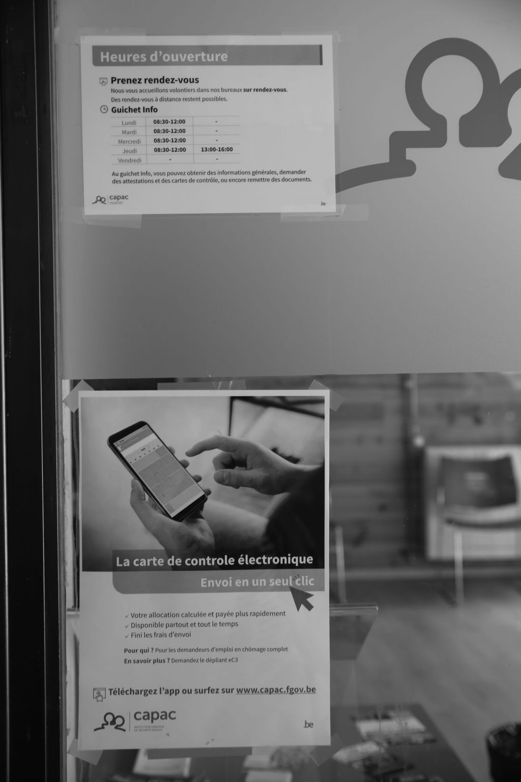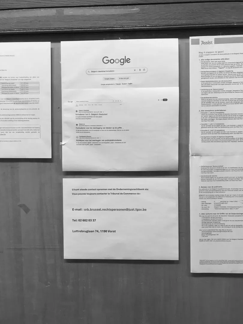 A screenshot of a Google search prompt is placed on an announcement board in the waitingroom at the Tribunal de commerce in Brussels. Where most public services seem to have embraced digitisation to some extend, the Tribunal to this day demands paper copies, and wet signatures.