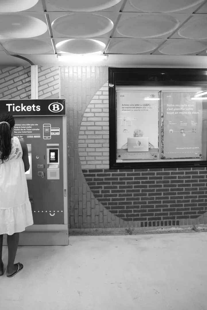 Een treinkaartje kun je in xxxx [naam station] nog enkel kopen bij een automaat, de balie is zoals in veel andere stations allang gesloten. Ernaast hangen affiches waarop Jeanine, een vrolijke dame op leeftijd, de reiziger aanspoort voortaan kaartjes online te kopen. De affiche ernaast belooft dat de SNCB-app nog twee keer sneller zou zijn.