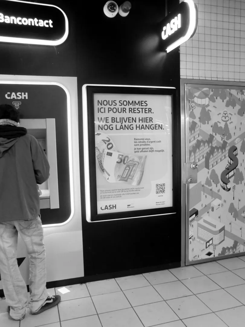 Metro Porte de Halle, Bruxelles. Nous sommes ici pour rester, we blijven hier nog even hangen. An advertisement placed next to a cash machine attempts to assure us in two languages. While providing access to cash is a legal obligation, banks have largely outsourced this service to an external company called CASH.