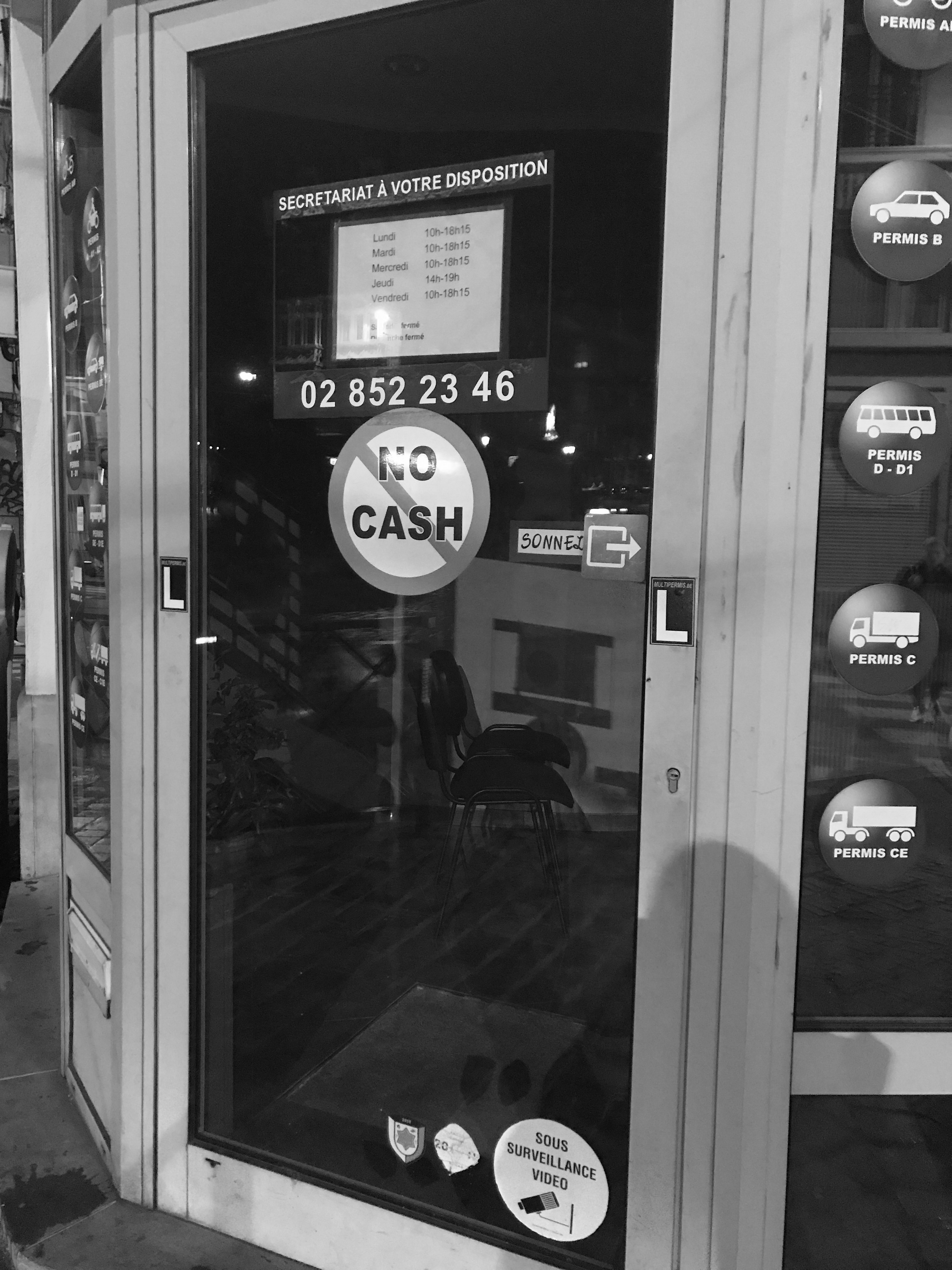 Met de sticker 'No Cash' bedoelt deze autorijschool in Brussel mogelijke dieven te ontmoedigen.