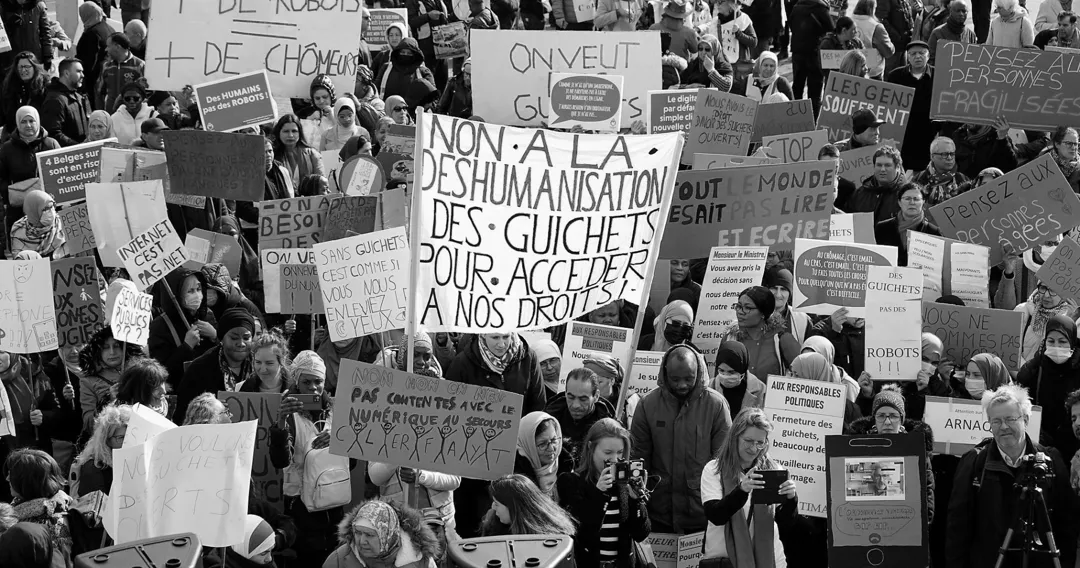 A large mass of people has gathered and holds various banners: "Non a la deshumanisation. Des guichets pour acceder a nous droits !", "Des Guichets, pas des robots ! ! !" et "Internet c'est pas net". Three years later, most households in Belgium are being connected to optic fibre, providing them with unprecedented bandwidth at home.