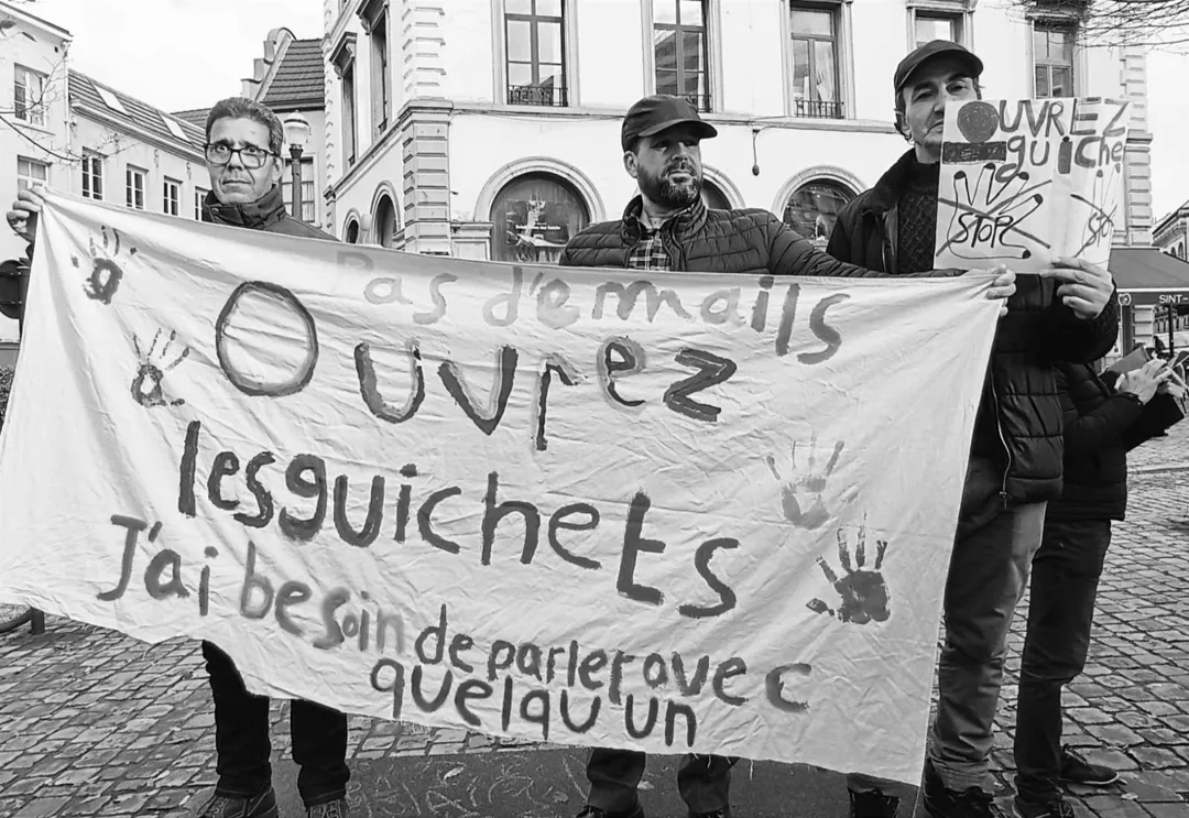 Three people hold up a handpainted banner which reads: Pas d'emails. Ouvrez les guichets. J'ai besoin de parler avec quelqu'un. Images from the action "L'humain d'abord" organised by Lire et Ecrire to resist the digitisation of all public administration.