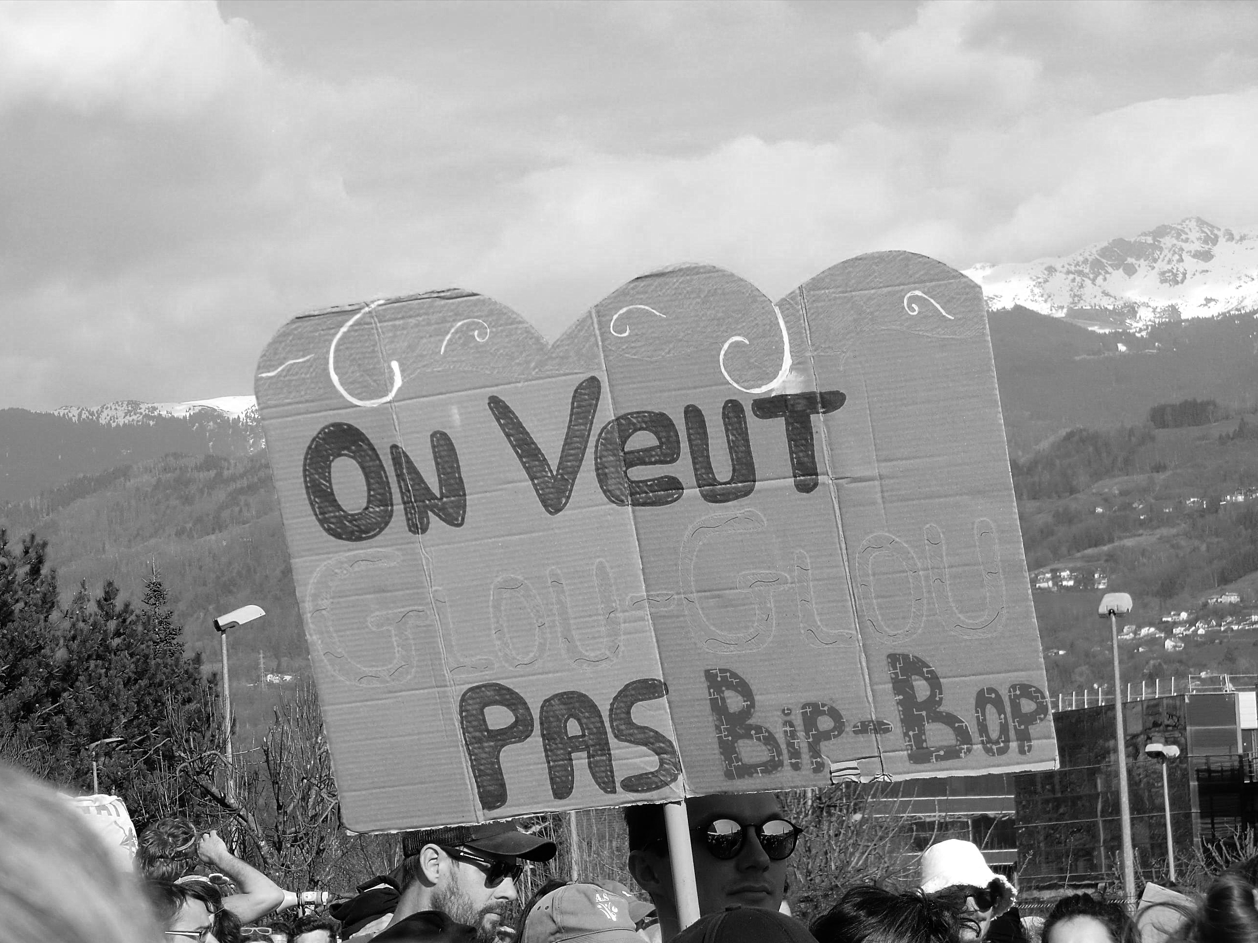 A protest sign is held against the backdrop of the Rhone-Alps near Grenoble, and reads "We Want Glug Glug Not Beep Beep". Thousands of protesters have gathered to resist the expansion of the SMTelectronics chip factory. At the heart of this protest is the imagination of a digital infrastructure in which water and food security is not put at risk.