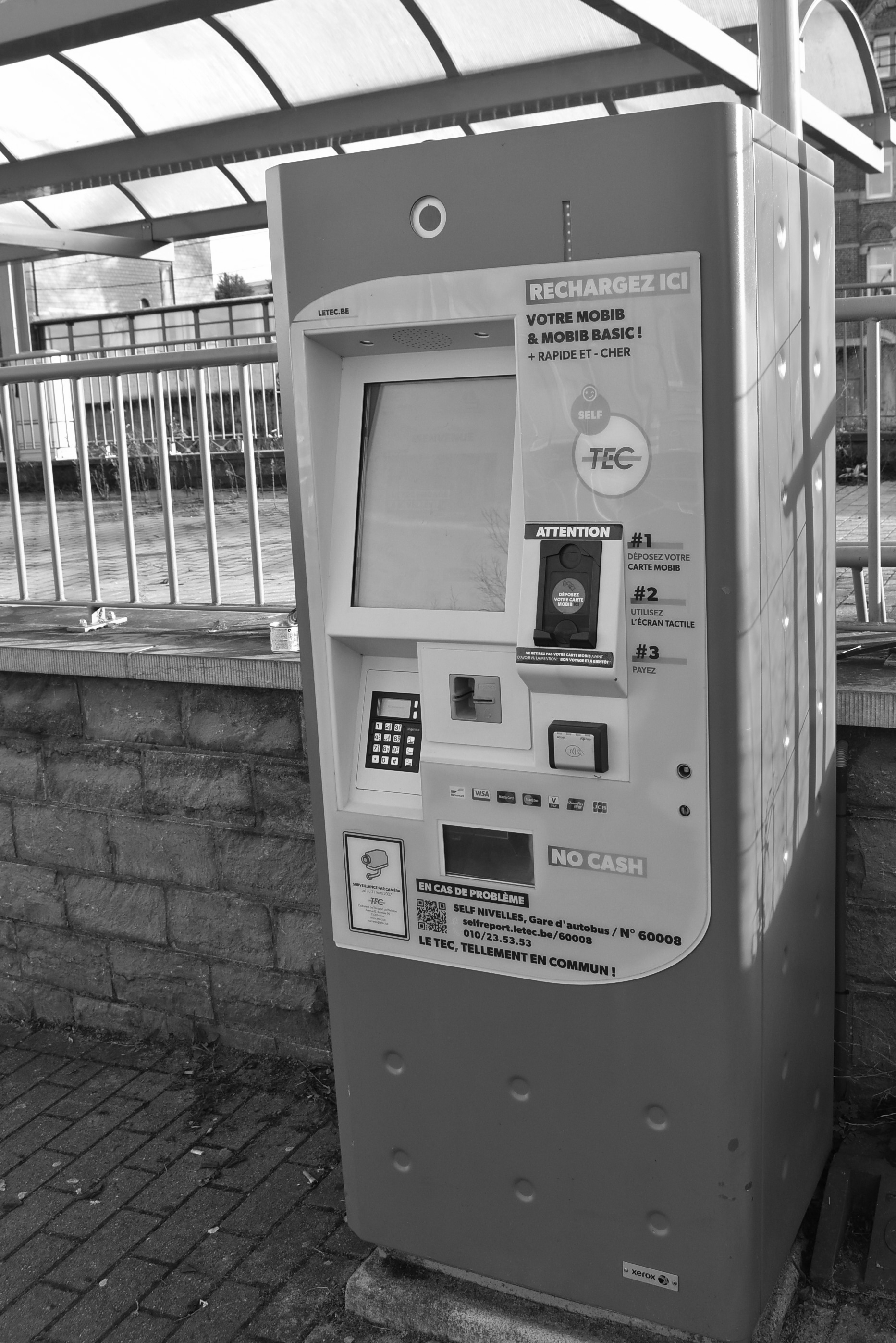 Deze TEC automaat op het station van Nijvel heeft een tactiel scherm, videobewaking en de mogelijkheid om contactloos te betalen maar accepteert geen cash.