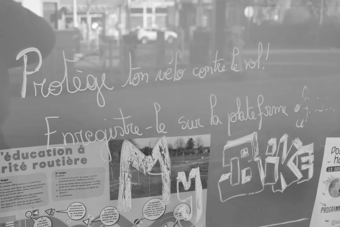Op een winkelruit in Nijvel, een handgeschreven advertentie voor een digitaal platform waarmee je je electrische fiets tegen diefstal zou kunnen beschermen.